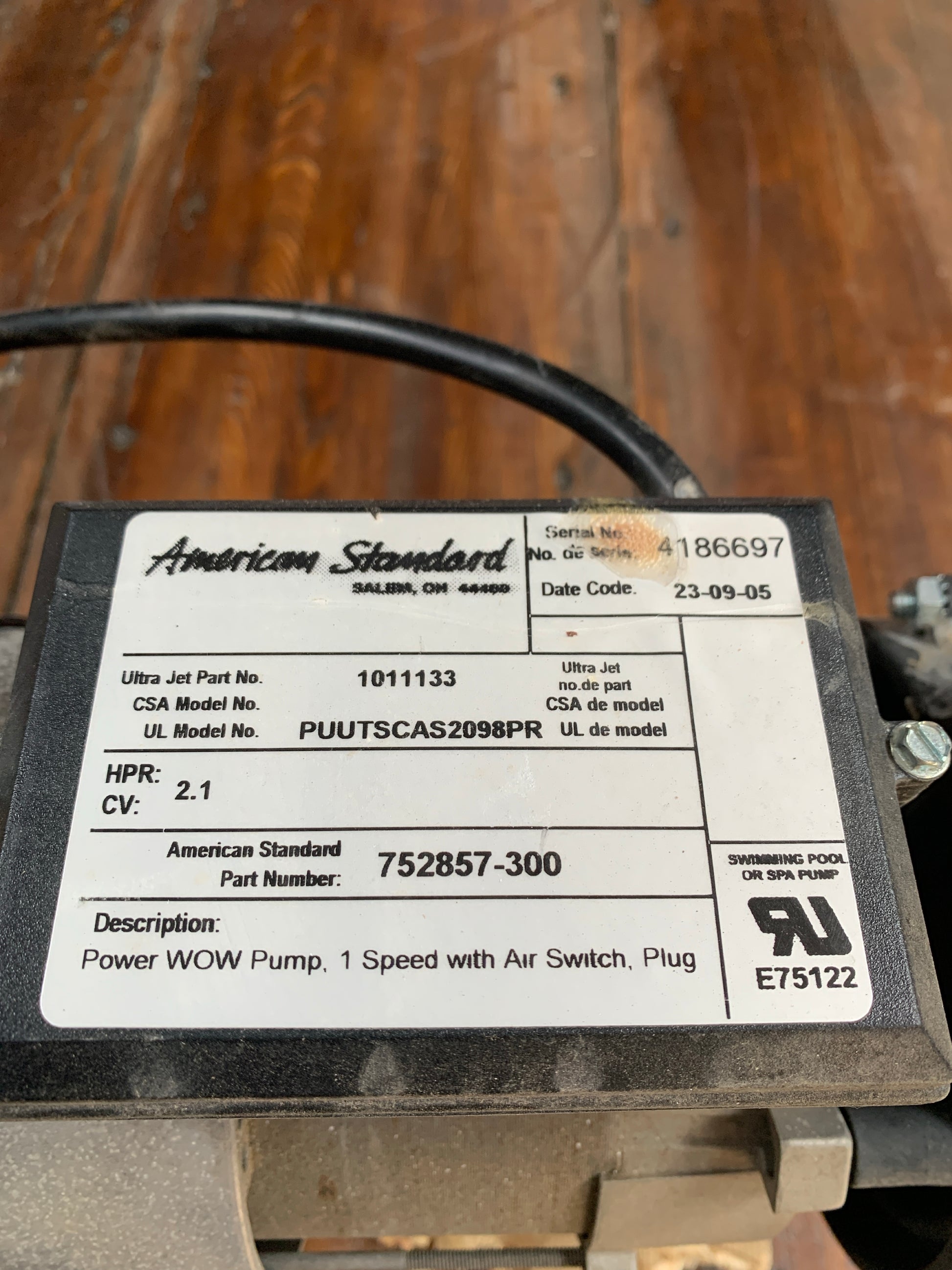This Power WOW Pump by American Standard is a 1-speed spa and pool pump equipped with an air switch and plug. Designed for high performance and quiet operation, it offers reliable flow for jetted tubs, spas, or small pools. Model F42E94A03 runs at 3450 RPM and comes mounted to a PVC and OSB test base. The cord has a standard 3-prong plug for convenience.