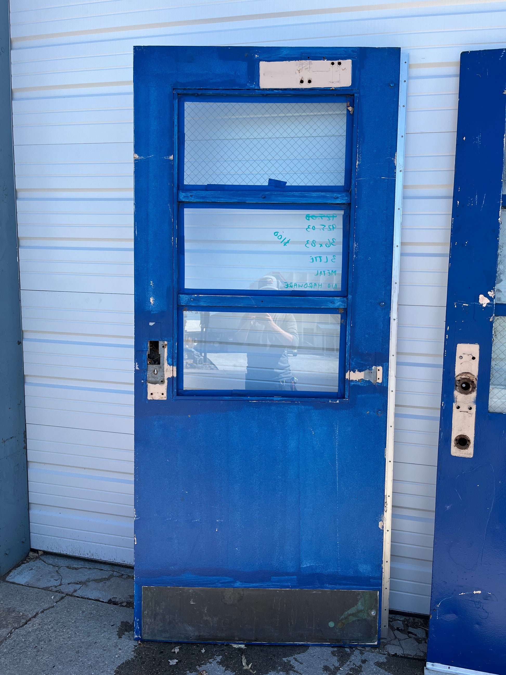 Heavy-duty metal door with three lites of wire-reinforced safety glass. Painted in bright blue with an industrial look, this door is perfect for commercial or workshop applications. Sturdy steel construction provides excellent durability and security.