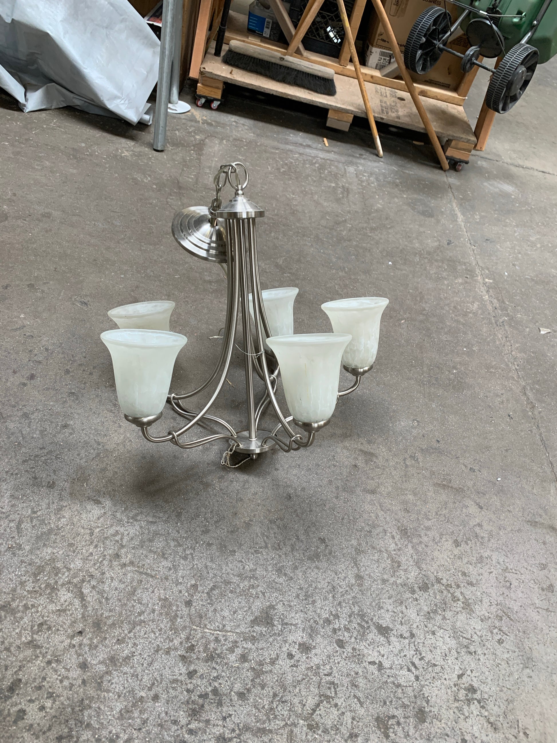 This modern brushed nickel chandelier features five upward-facing tulip-style shades made of frosted marbled glass. Its clean lines and gentle curves make it a versatile fit for dining areas, foyers, or stairwells. Comes with chain and ceiling canopy for easy installation. Compatible with standard E26 base bulbs (bulbs included, but not guaranteed).