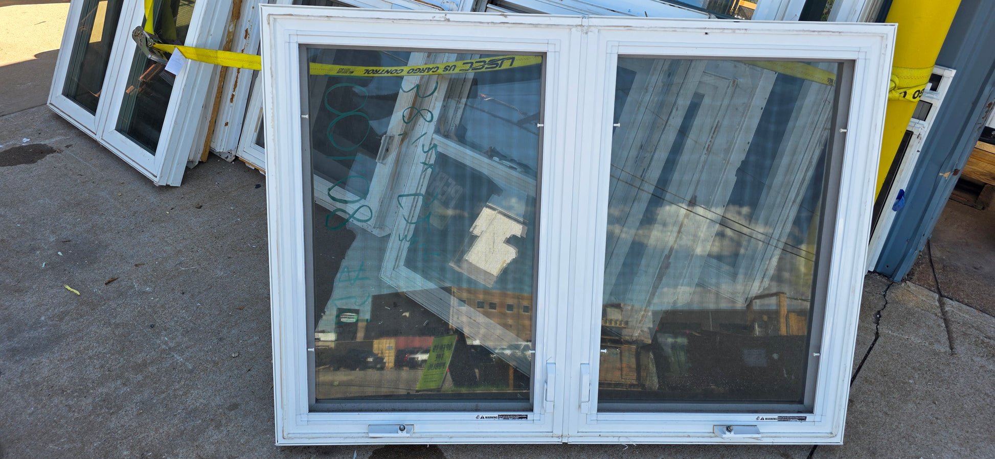 Salvaged double-paned window with clear insulated glass and a durable white vinyl frame. The square design makes it a versatile option for replacements or creative repurposing projects such as sheds, workshops, or greenhouses.