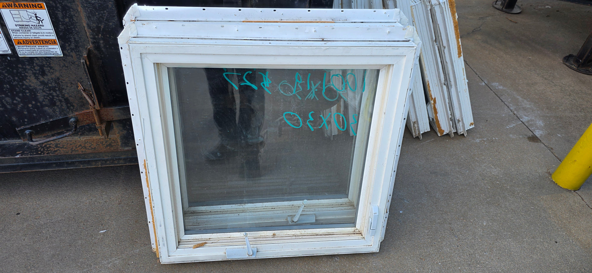 Salvaged double-paned window with clear insulated glass and a white vinyl frame. The square size makes it a practical fit for replacements or for creative reuse projects such as sheds, workshops, or greenhouses.