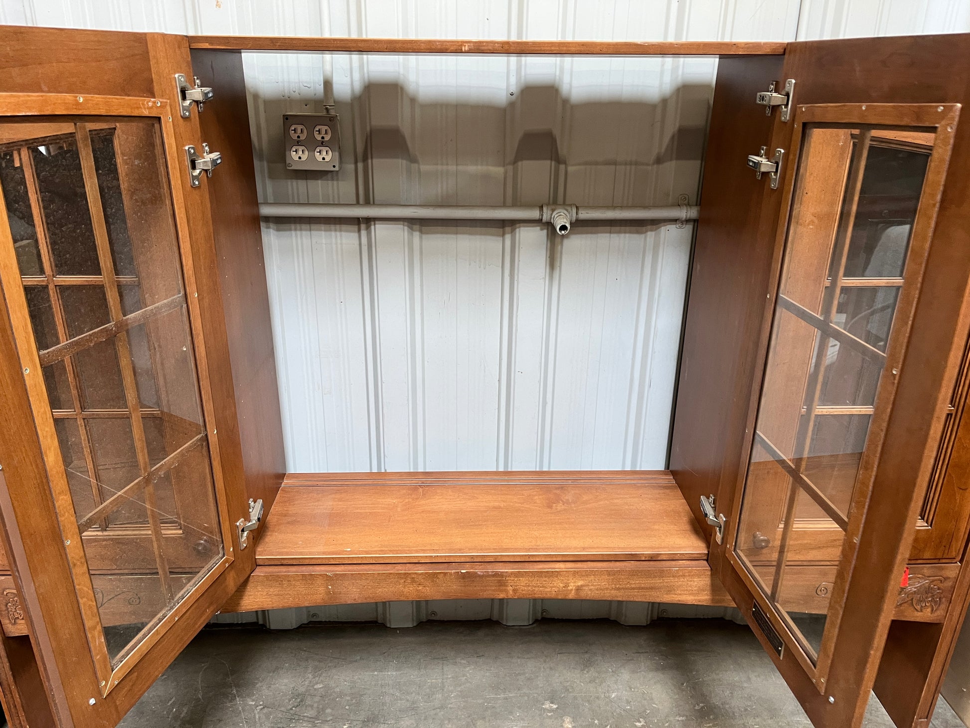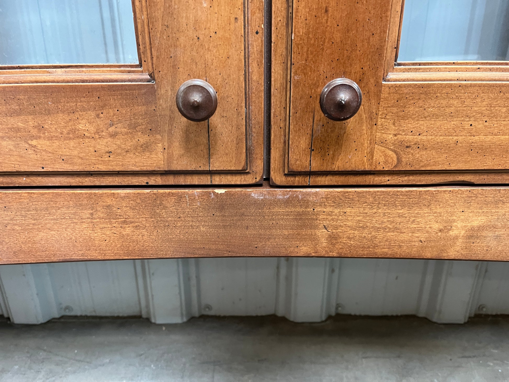 Elegant wood display cabinet with four glass-paned doors and decorative detailing. Perfect for showcasing dishware, collectibles, or books while adding a classic touch to any room.