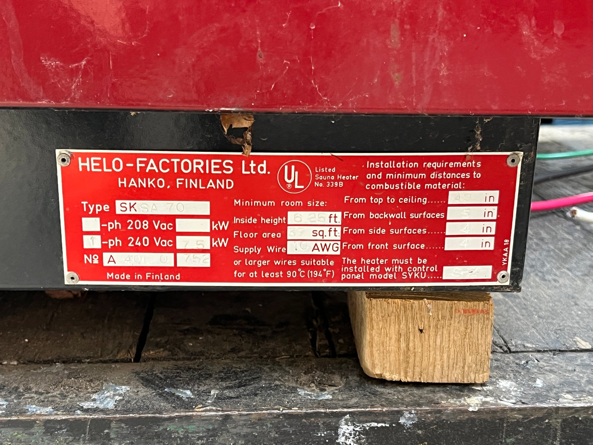 Helo SKSA70 electric sauna heater, 7.5 kW at 240V (single-phase). Solid working unit with normal cosmetic wear. Includes a full bucket of sauna stones. Controller is not included.