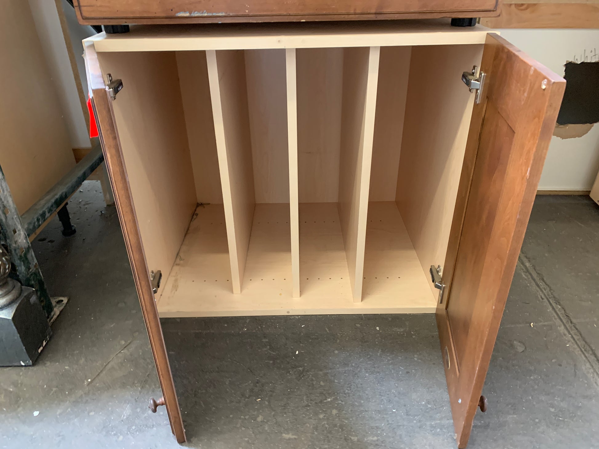 Reclaimed upper kitchen cabinet with dividers for cutting boards and pans. It has some scratches but overall well-maintained.