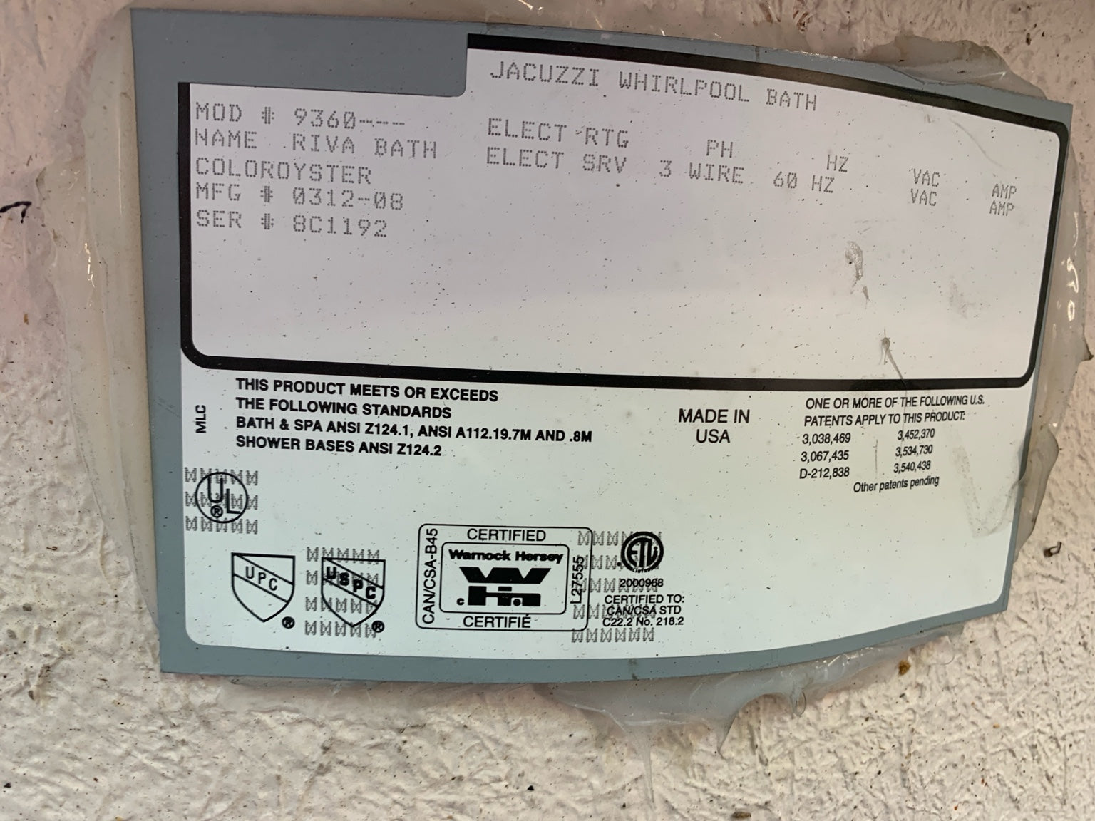Brand & Model: Jacuzzi Riva Bath, Model #9360