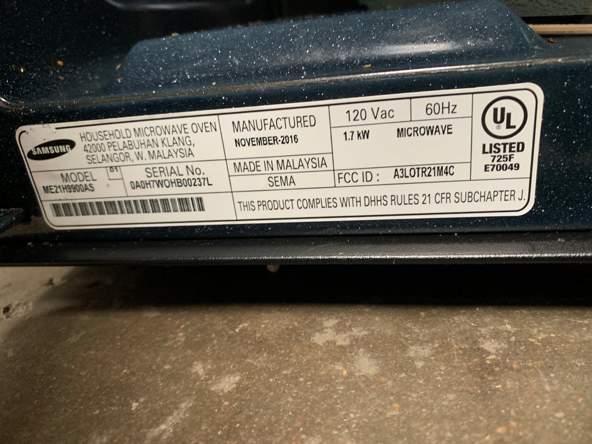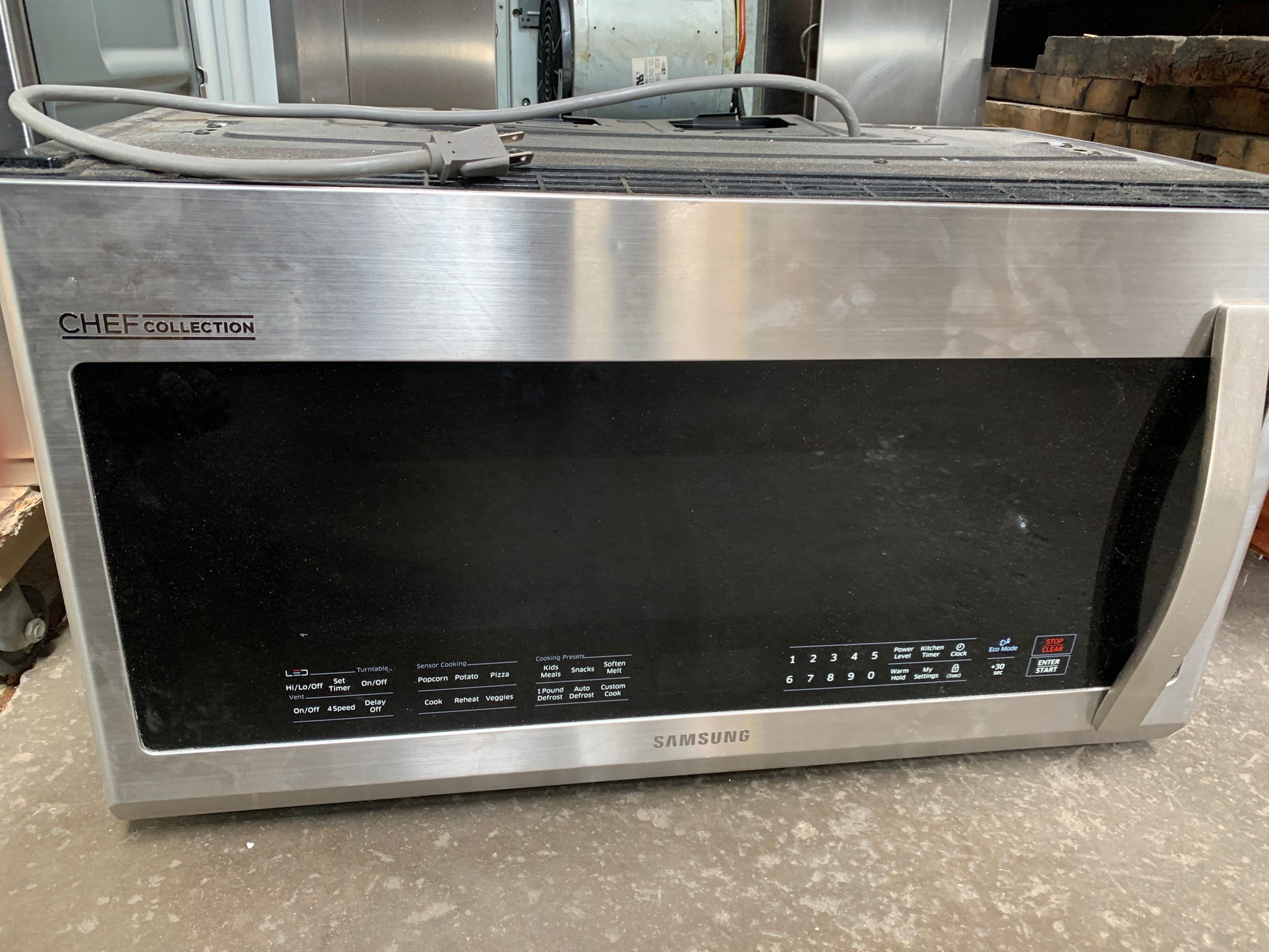 This is a Samsung Chef Collection over-the-range microwave, model ME21H9900AS. It features a spacious 2.1 cubic foot capacity, LED cooktop lighting, sensor cooking options, and a sleek stainless steel design. Built to be mounted above the range, it includes a ventilation system with multiple fan speeds. Manufactured in November 2016, this unit shows exterior dust and light cosmetic wear from storage but is in overall good condition.