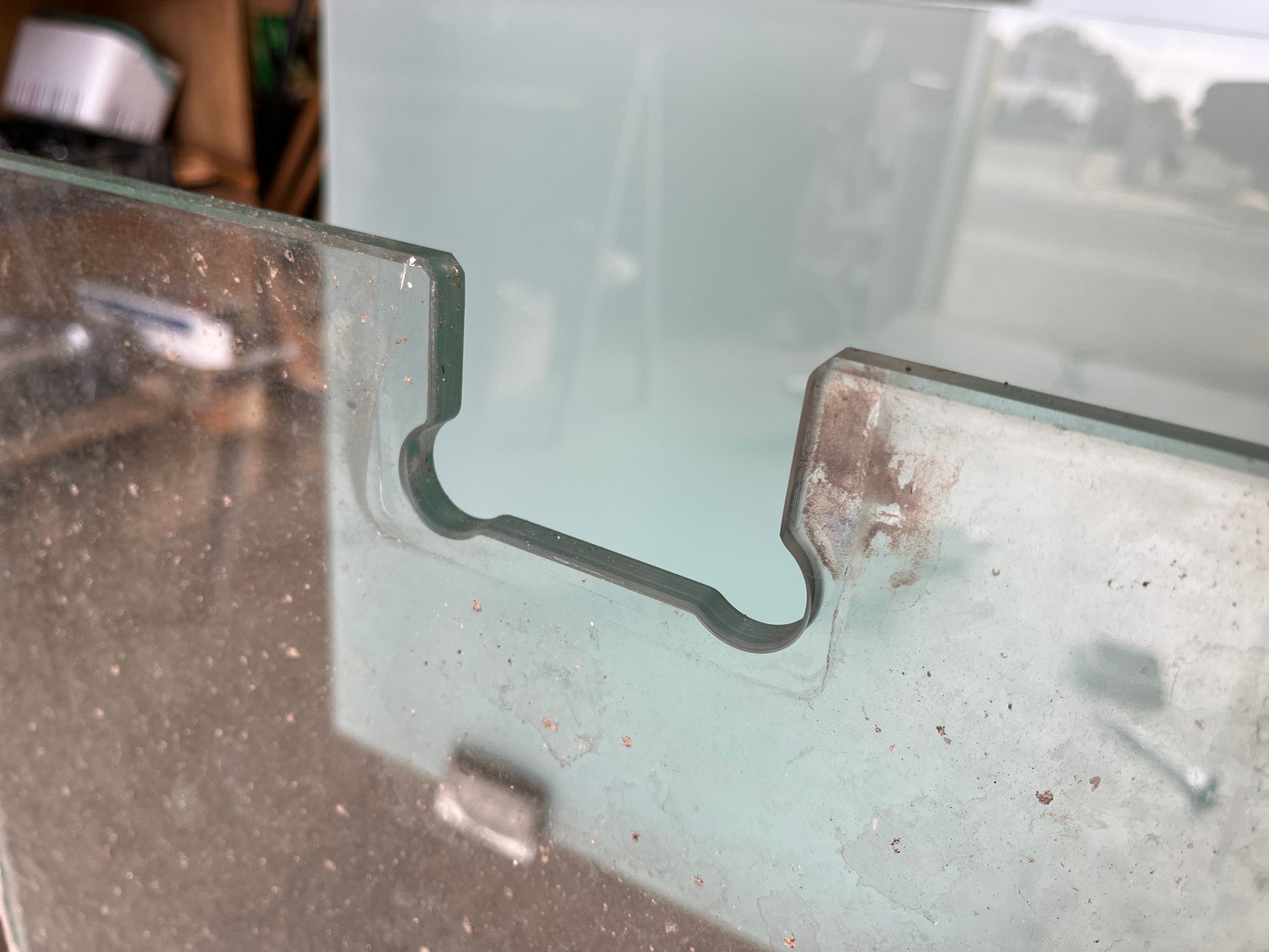 This is a tall tempered glass shower door, measuring 25 inches wide by 79 inches high with a thickness of 5/16 inch. The panel is precision notched at the edges for hinge or hardware placement, making it suitable for frameless or semi-frameless shower installations. Glass is clear with polished edges and shows some light surface dust from storage but no cracks or major defects.