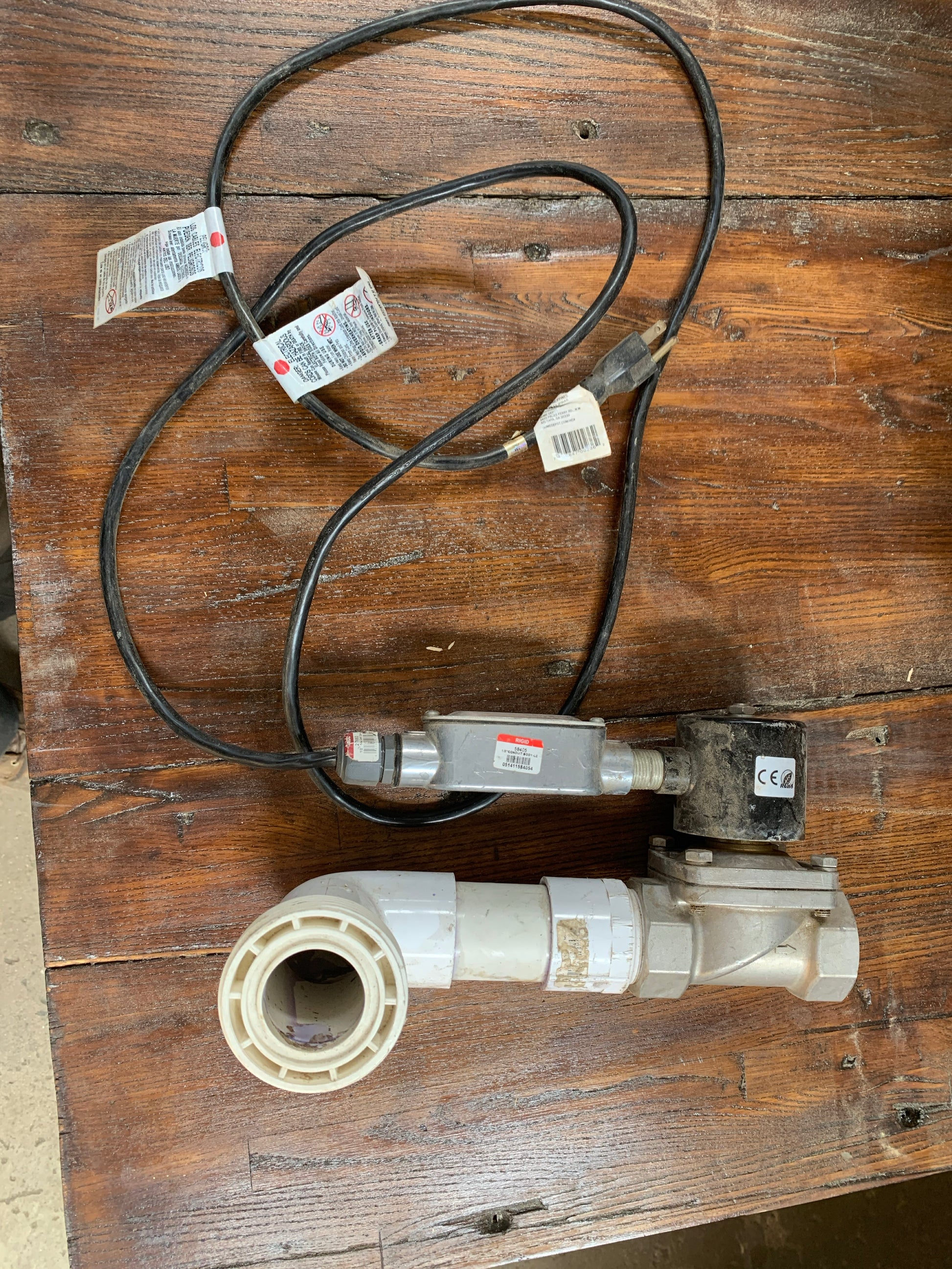 Brand & Model: Unbranded valve body; power cord tag shows model 27693 (1/2" NM Cord Connector)