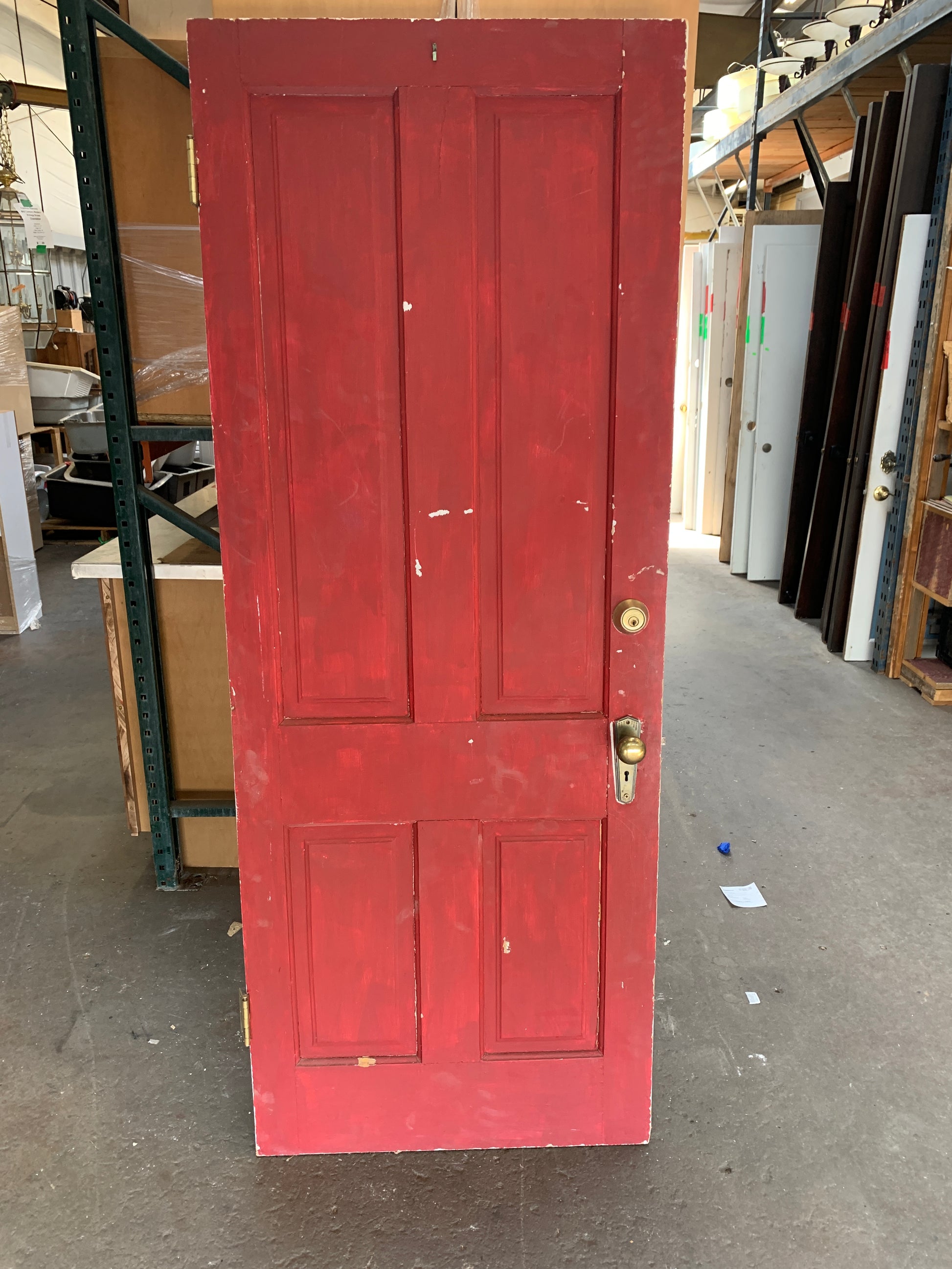 This is a vintage solid wood door featuring a 4-panel design and a bold red painted finish. The door shows noticeable wear, scuffs, and paint chipping consistent with age, but remains sturdy and functional. Equipped with brass hinges and an antique-style brass keyhole lockset. Its distressed character makes it a good candidate for restoration, reuse in a rustic or eclectic setting, or repurposing into furniture or décor. Key's not included.