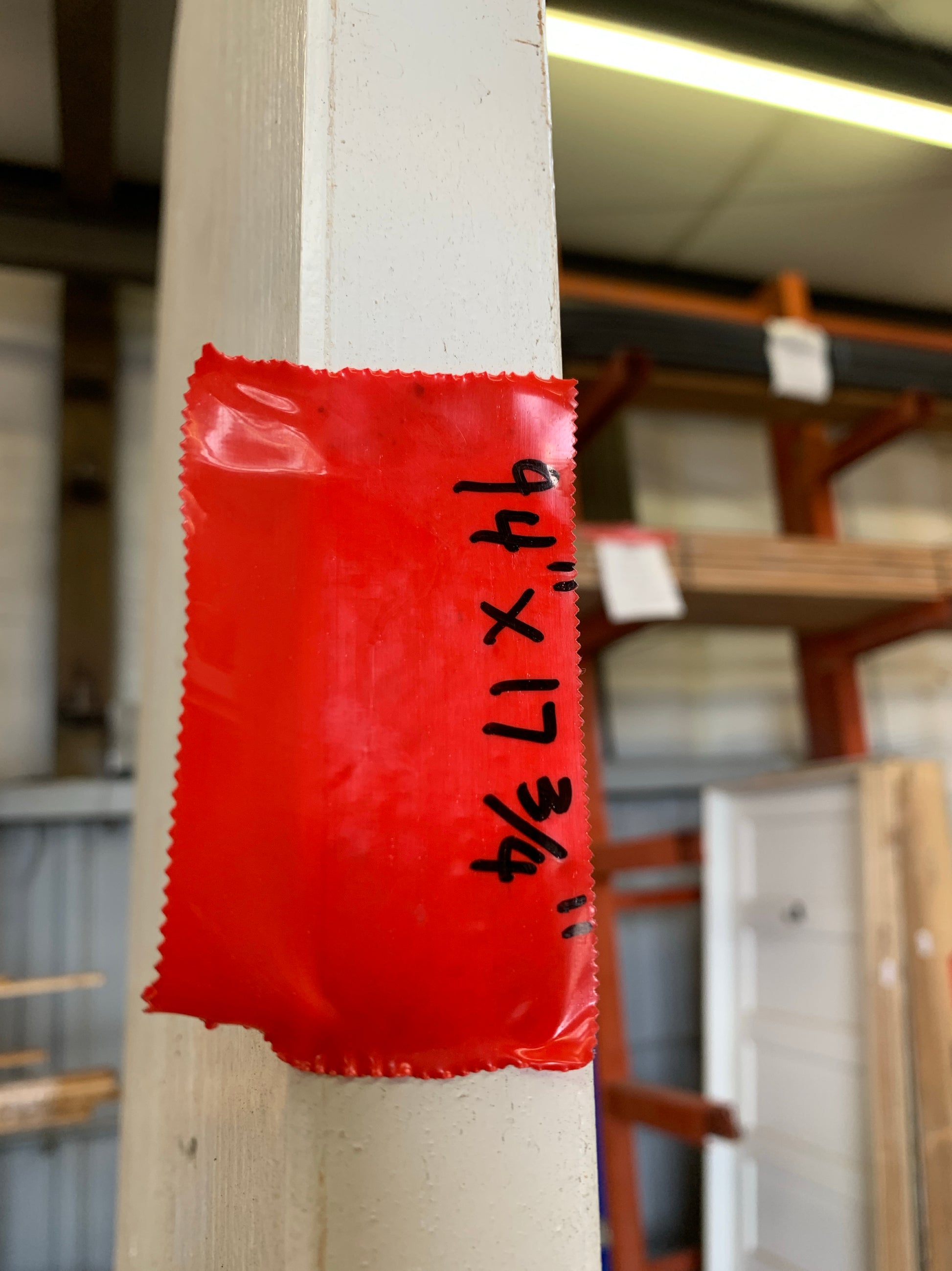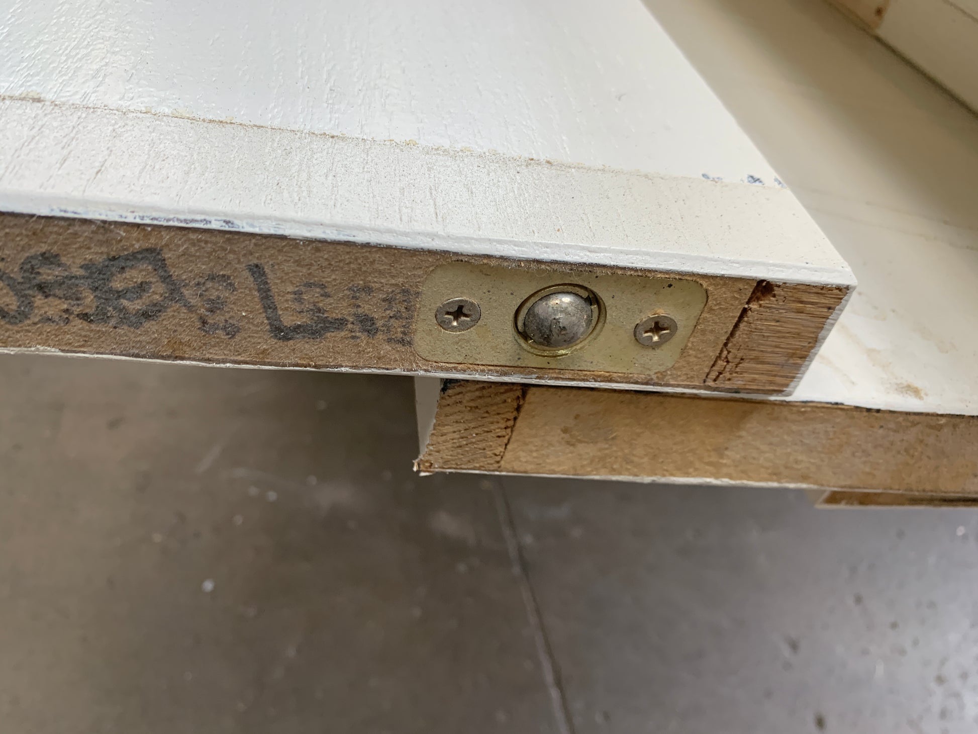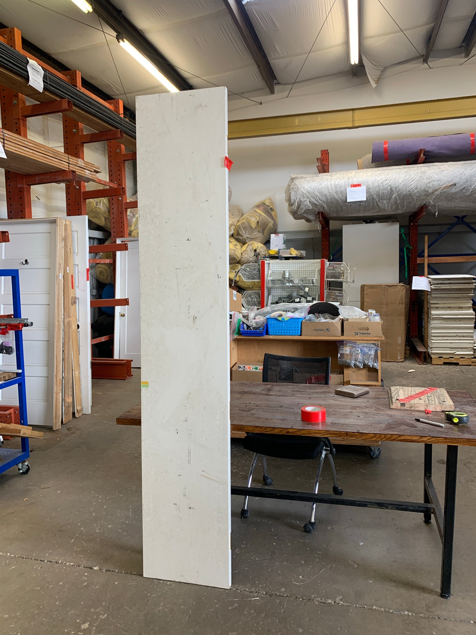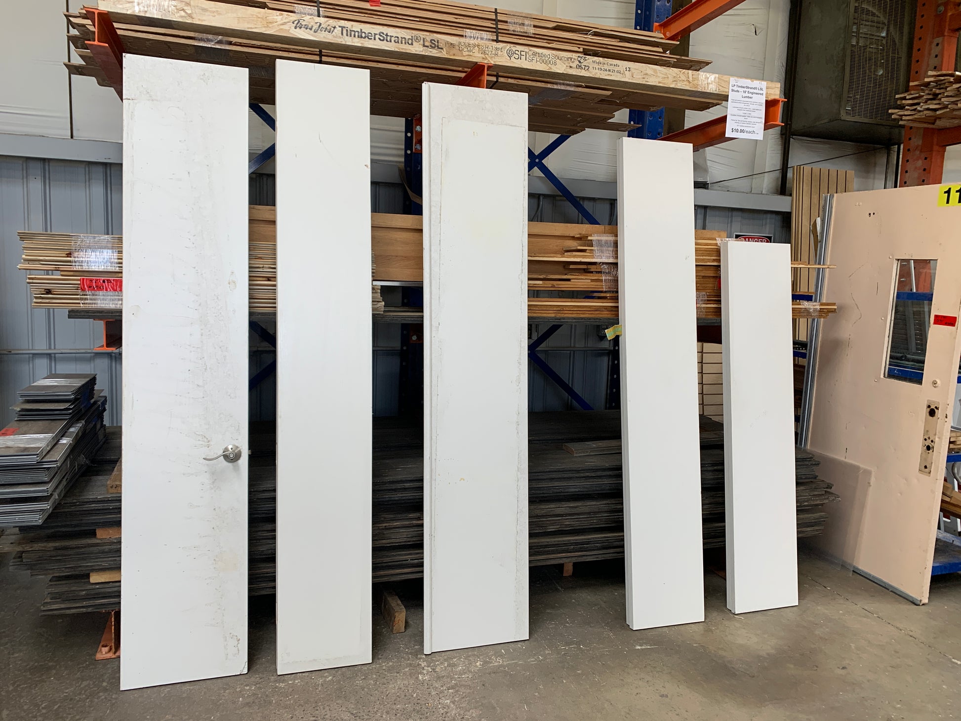 Features: Plain white flat-surface slab door with no panels, hinge mortises present, previously installed